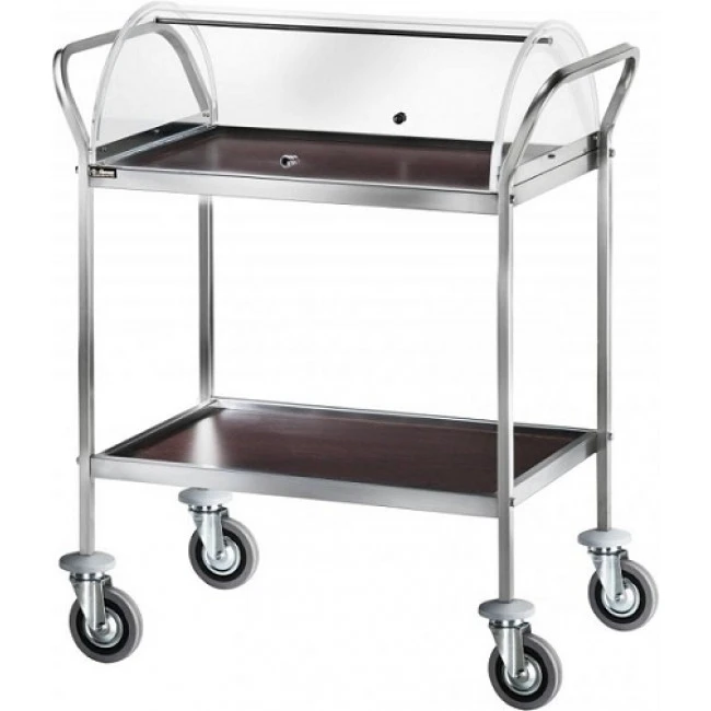 Ideale per dolci, antipasti e formaggi. Struttura articolo acciaio inox con piano in nobilitato Wengè con cornice perimetrale in acciaio inox e cupola in plexiglas semicircolare con coperchi rientranti.