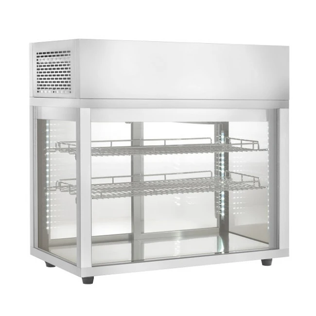 Adatto per conservazione di prodotti alimentari a temperature positive. Struttura interna ed esterna in acciaio inox e vetro, refrigerazione ventilata con gruppo incorporato nella parte superiore dell’espositore. Dotato di centralina digiale per controllo temperatura e sbrinamento, doppi vetri temperati su tutti i lati, nelle porte e sulla parte superiore. Porte scorrevoli sul lato operatore. Illuminazione interne con strisce LED nei 4 angoli.