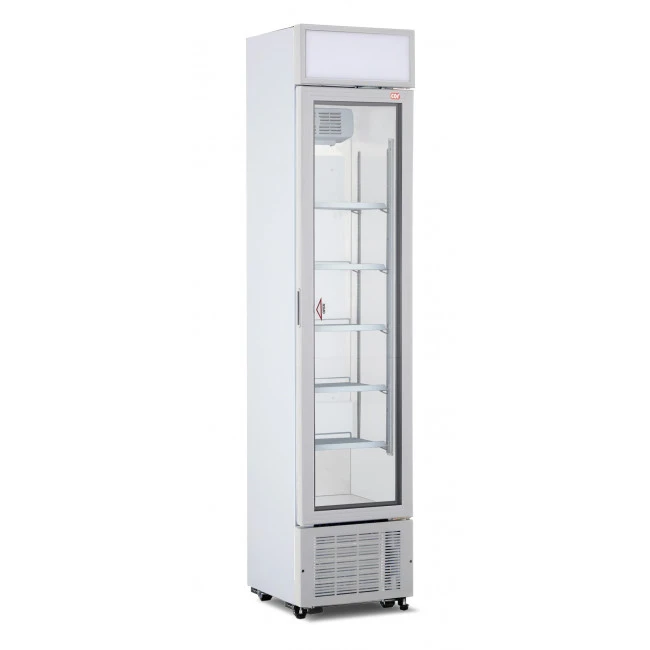 Espositore verticale a refrigerazione ventilata con cassonetto luminoso. Chiusura con porta a battente con ritorno automatico. Griglie regolabili in altezza.