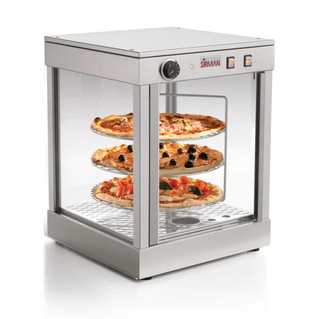 Vetrinetta per l’esposizione di pizze, brioches, torte, sfoglie e stuzzichini vari, che mantiene costante la temperatura e conserva a lungo il sapore e la morbidezza dei cibi.