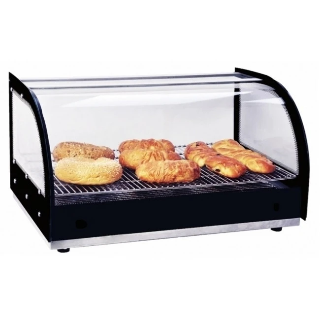 Fianchi in vetro temperato con frontale ricurvo cpon basamento in acciaio inox e sistema di riscaldamento con resistenza