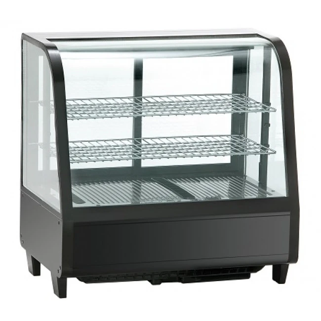 Struttura in metallo e materiale plastico di colore nero lucido, per esposizione e conservazione di pasticceria , gastronomia, bibite, lattine e alimenti in genere. Vetri su 4 lati e vetri posteriori scorrevoli.