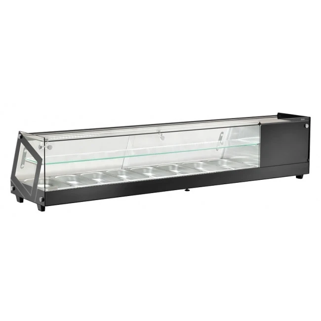 Adatta per esposizione e conservazione di tapas di grande impatto visivo, con refrigerazione nella sola parte inferiore della vetrina (vano vaschette GN). Il gas refrigerante R600a è ad alta efficienza e basso impatto ambientale. La struttura interne ed esterna è in vetro, plastica ed acciaio inox. Dotata di refrigerazione statica con gruppo incorporato, termostato digitale per il controllo della temperatura, vetri temperati, porte scorrevoli sul lato operatore e ripiano intermedio in vetro. Dotata inoltre di illuminazione interna a LED nella parte superiore.